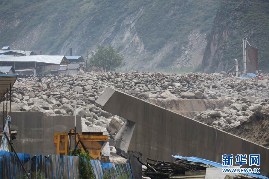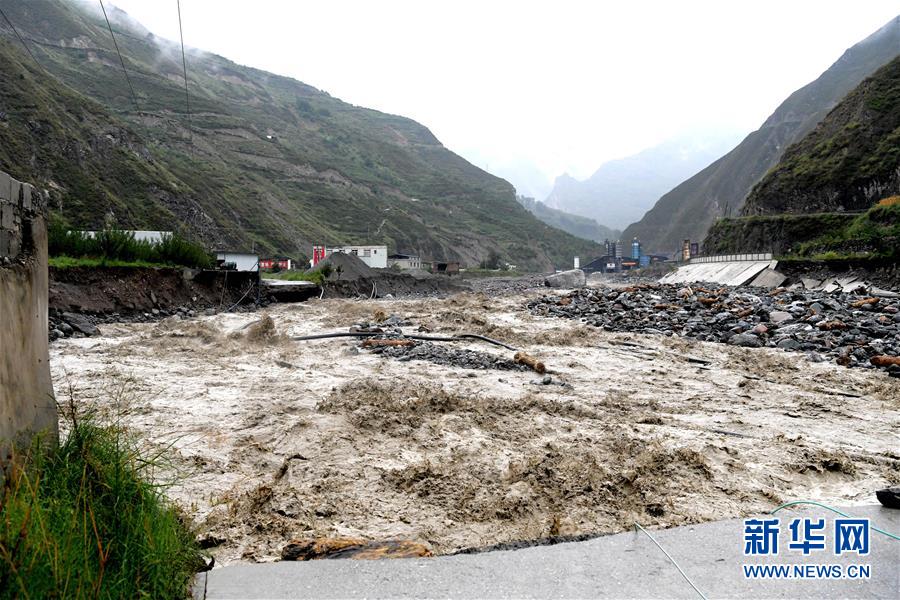 8月20日拍摄的汶川县雁门镇麦地沟山洪泥石流灾害现场。 8月20日凌晨2时许,四川省阿坝州汶川县因强降雨致多个乡镇不同程度发生山洪泥石流灾害,多地道路、电力、通讯中断,造成人员伤亡。1名消防员在救援中牺牲。 新华社发(伍排勇 摄)
