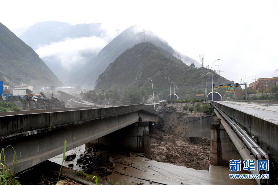 8月20日,都汶高速绵虒段板桥山隧道口桥梁被冲毁。 8月20日凌晨2时许,四川省阿坝州汶川县因强降雨致多个乡镇不同程度发生山洪泥石流灾害,多地道路、电力、通讯中断,造成人员伤亡。1名消防员在救援中牺牲。 新华社发(伍排勇 摄)